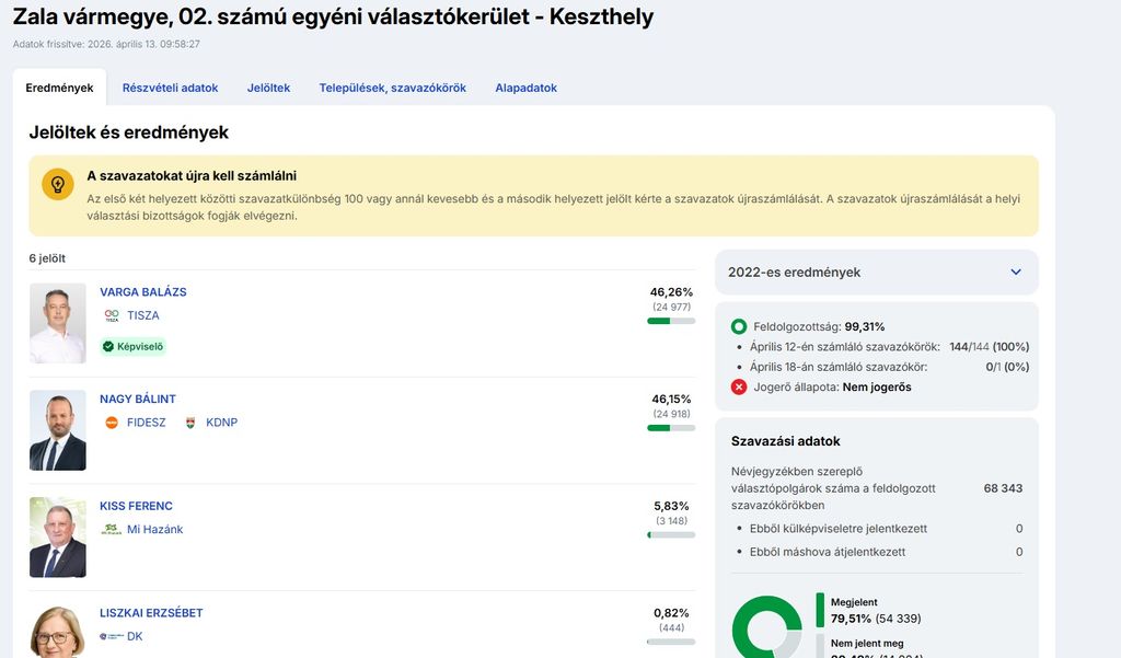 Újraszámolják a szavazatokat a Zala vármegyei 2. számú (keszthelyi) egyéni választókerületben, mert az első két helyezett közötti szavazatkülönbség kevesebb száznál, és a második helyezett jelölt kérte a szavazatok újraszámlálását – derül ki a Nemzeti Választási Iroda hétfő délelőtti adataiból.